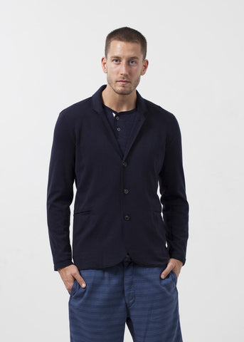 Amiable texture for the pleasure seeking. Plenty of stretch with the coolness of summer. Four button closure at front. Two exterior pockets, one interior. Homecore. Color Navy. 90% Cotton, 10% Elastane. Made in Portugal.  Matt is wearing a Large. Matt is 6’2”, Chest 38”, Waist 31”, Inseam 34.5”.
